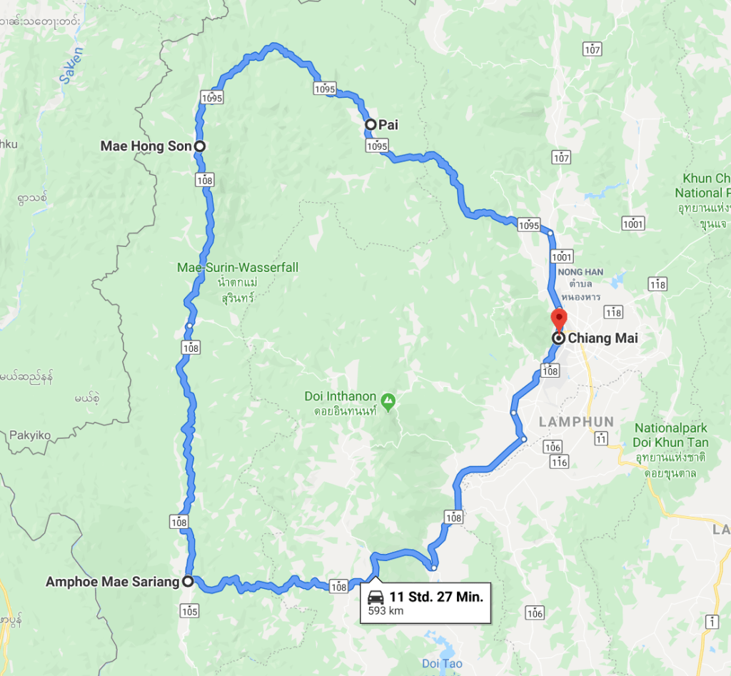 Am Freitag haben wir ein Auto gemietet, um den Loop zu fahren: Chiang Mai nach Pai, dann Mae Hong Son, dann Mae Sariang und wieder zurück.