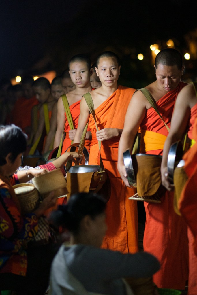 Und wir haben wir den morgendlichen Almosengang der laotischen Mönche gesehen. Das lief etwas anders ab. Die Geber sitzen auf Stühlchen und haben Reis vor sich, die Mönche laufen die Reihen ab und erhalten Klebreis in die Schale – entweder mit der Hand oder mit einem Löffelchen. Das läuft in Stille ab, kein Gebet, kein Dank. Surreal – es waren so viele Geber da, die Mönche liefen die Reihen ab und alle 20m war ein Eimer, da wurde dann der überschüssige Reis von den Mönchen wieder reingeworfen. Ums Eck knieten dann Arme, denen wurde von den Mönchen z.T. wieder was abgegeben. Eine gigantische Reis-geht durch-alle-Hände-und-wird umverteilt-Geschichte. Für uns echt surreal. Der Geber fühlt sich gut, egal, ob sein Reis dann wieder im Eimer landet. Ich hoffe, dass die Armen dann auch den restlichen Reis aus den Eimern bekommen. Warum der dann von allen angefasst werden muss, das ist für westliche Touristen wie uns schon seltsam.