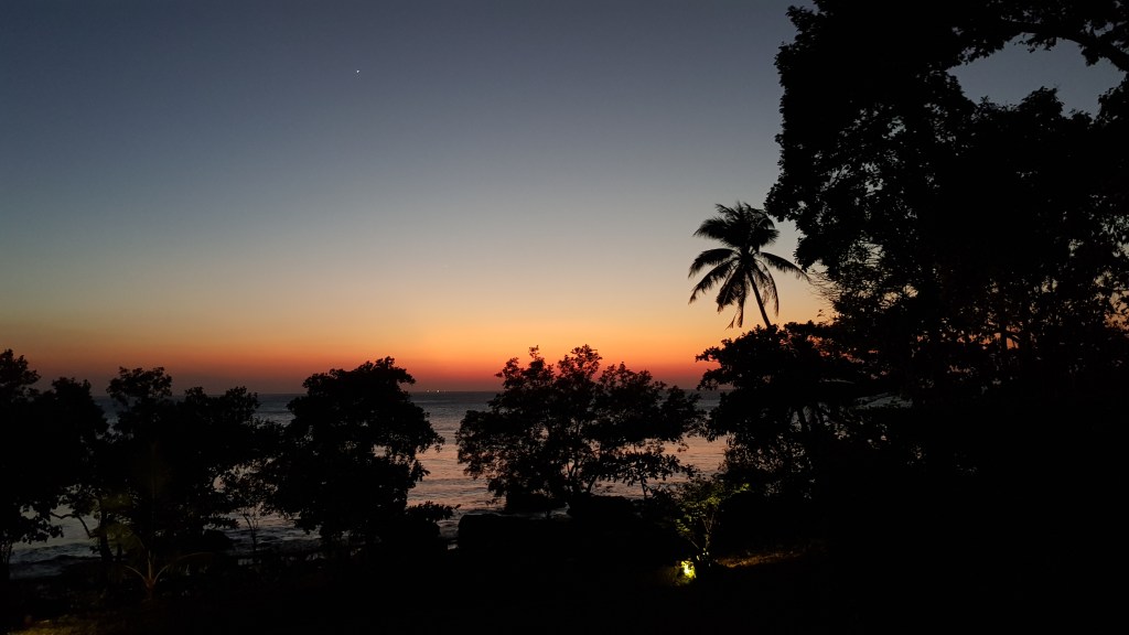 Man stelle sich vor: ein laues Lüftchen – eine angenehme Brise – , das sanfte Plätschern der Wellen, ein bisschen Vogelgezwitscher und ab und zu ein Gekko. Und das alles direkt vor der Haustür. Dazu abends die schönsten Sonnenuntergänge…natürlich haben wir noch 2 Tage verlängert!