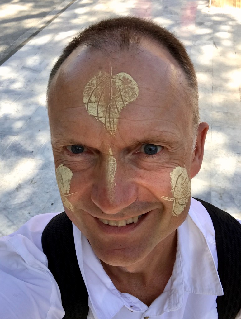 Die Welt ist ein Dorf: in den meisten Ländern orientiert man sich nach Westen. Leute tragen Jeans und T-Shirts, es gibt Starbucks und McDonalds, westliche Werbung. Myanmar hat davon fast noch nichts. Bin mir nicht sicher, ob das so bleibt, aber aktuell ist das einfach spannend! Auf jeden Fall hat man sich bislang kulturelle Identität bewahrt! Diese liegt im Wesentlichen an 2 Dingen: Tharnaka und Longyi (spricht sich longtschi).