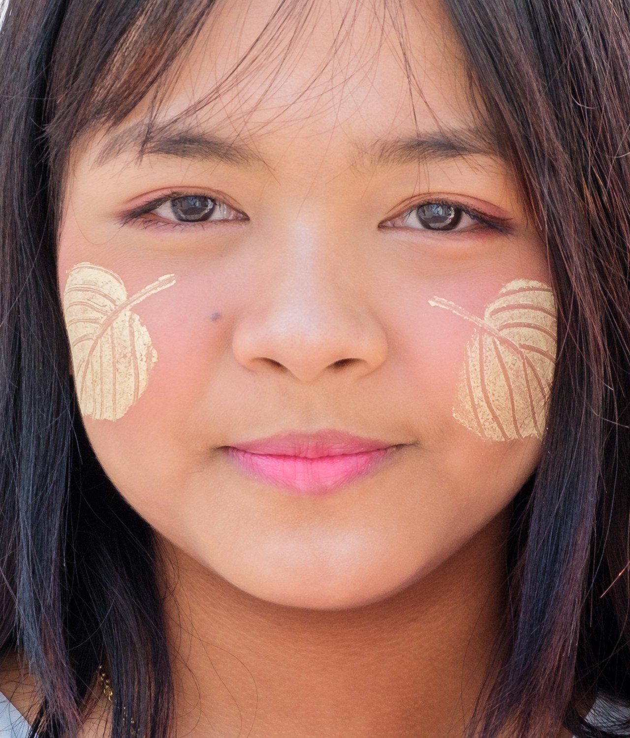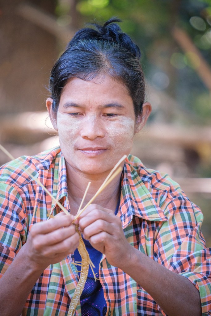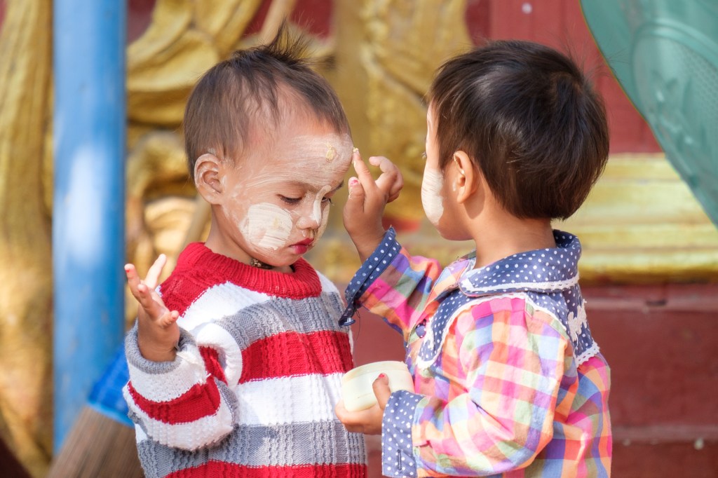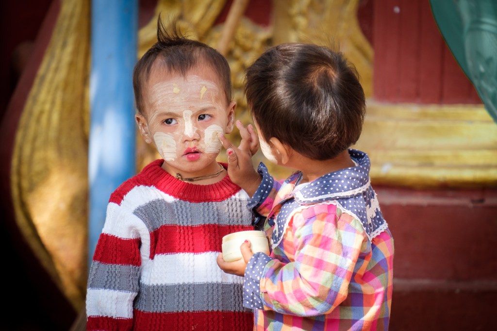 Als erstes aufgefallen sind uns die Gesichter, die mit Tharnaka Paste verziert sind. Tharnaka Paste wird aus der Rinde eines Baumes gewonnen, die Rinde wird gerieben und mit Wasser zu einer Paste vermengt. Das tragen vor allem Frauen, aber auch junge Männer. Die Creme ist quasi Make up – burmesisches Make up. Sonnenschutz und Verzierung in einem. Das hat schon was Eigenes und haben wir in dieser Menge so noch nicht gesehen. Manchmal aufgetragen wie Rouge, manchmal wie Kriegsbemalung.