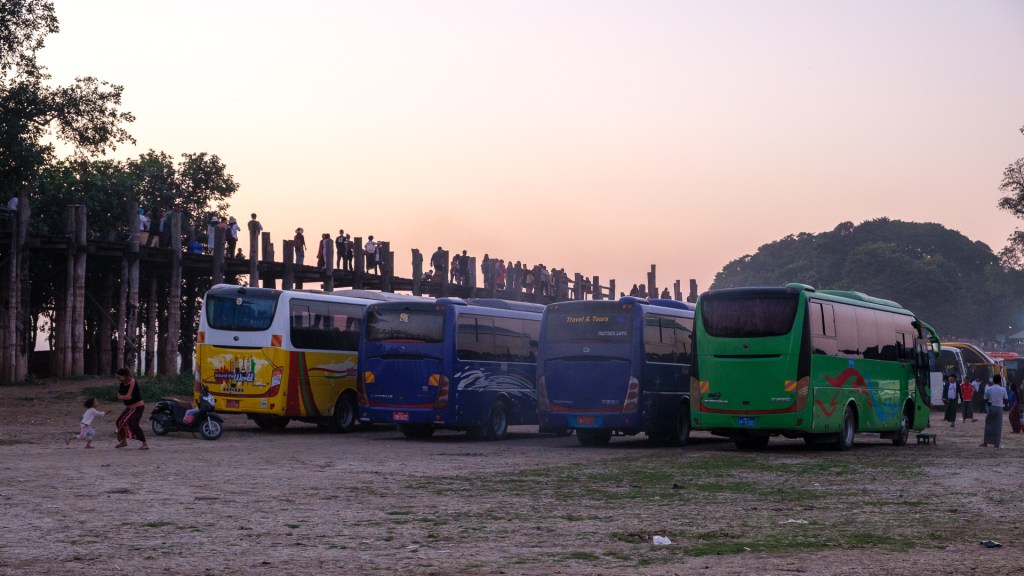 Wir waren zuerst an der U-Bein-Bridge, der längsten Teakbrücke der Welt, ca 1,2 km lang. Das war echt was los. Wir sehen wieder die vielen chinesischen Reisebusse. Wo auch immer die sich tagsüber versteckt haben, abends sind alle hier. Die Brücke hat kein Geländer, da muss man echt aufpassen bei so viel Trubel. Trotzdem ein sehr schöner Ort für den Sonnenuntergang.