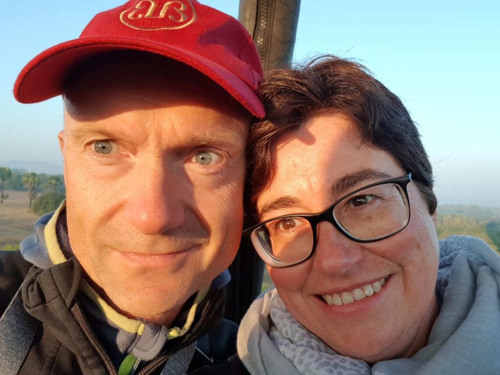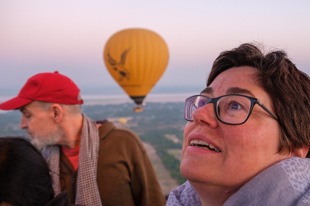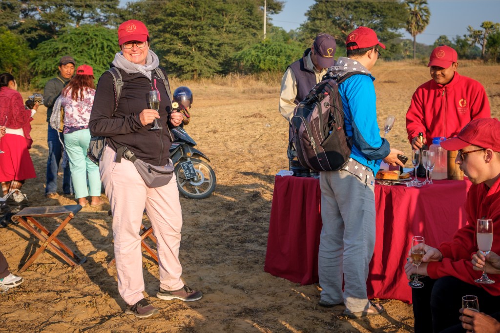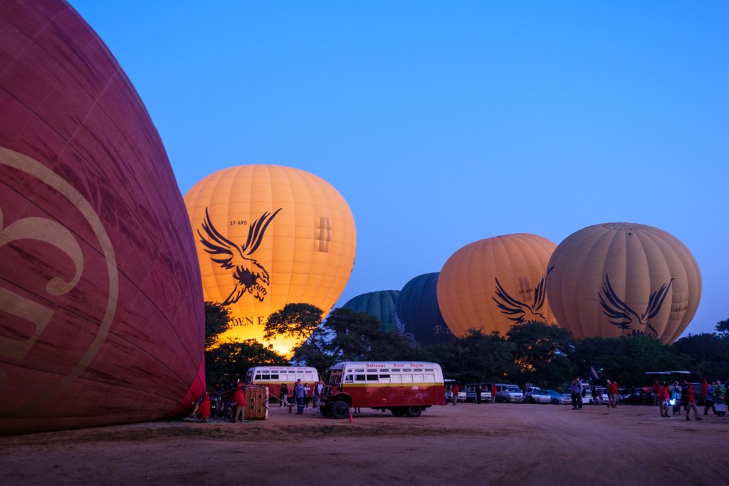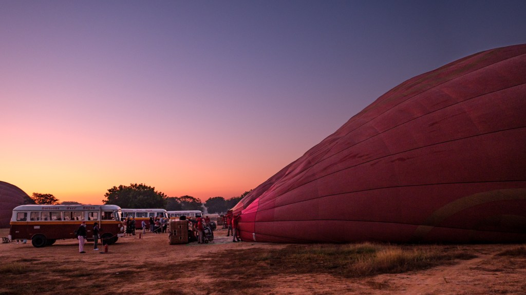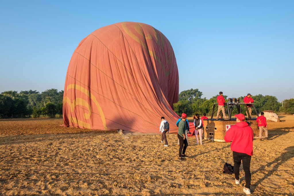 Von unserem Hotel aus haben wir von der Frühstücksterrasse morgens die Ballons starten sehen – und waren nun doch angefixt. Unsere Concierge an der Rezeption hat dann das Wunder möglich gemacht und uns 2 Plätze bei ‚Balloons over Bagan‘ verschafft zu einem reduzierten Standby Tarif (pro Person immer noch 280 USD). Es gibt 4 Ballonfirmen hier, das war aber die erste und ist die größte mit insgesamt 12 Ballons.