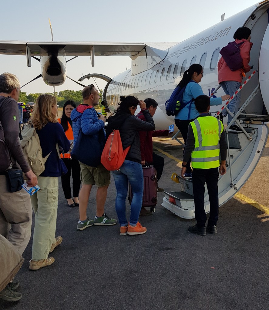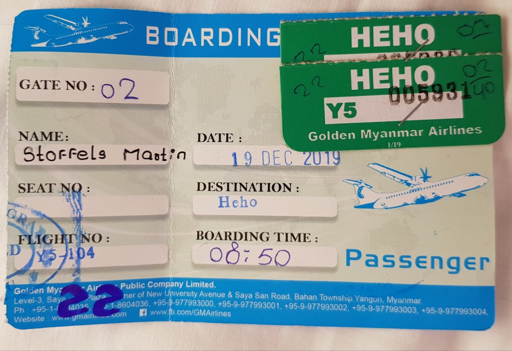 Wir haben einen Inlandsflug gebucht – die Straßen in Myanmar sind teilweise sehr schlecht und jede Ortsveränderung ist eine komplette Tagesreise. Also Flug von Nyaung-U nach Heho, dem nächsten kleinen Flughafen.