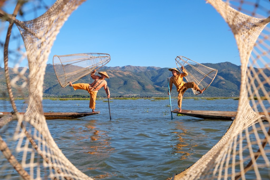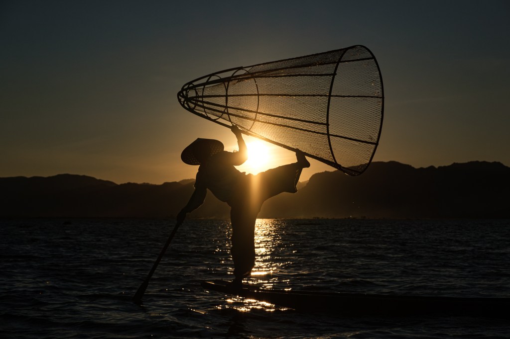 Die Einbeinruderer fischen übrigens ganz normal mit T-shirt/Hose oder Longyi. Die weiter unten gezeigten sind in traditionellerer Kleidung – sieht auf dem Foto schöner aus und kostet dann halt ein paar Kyat… (spricht sich tschat)