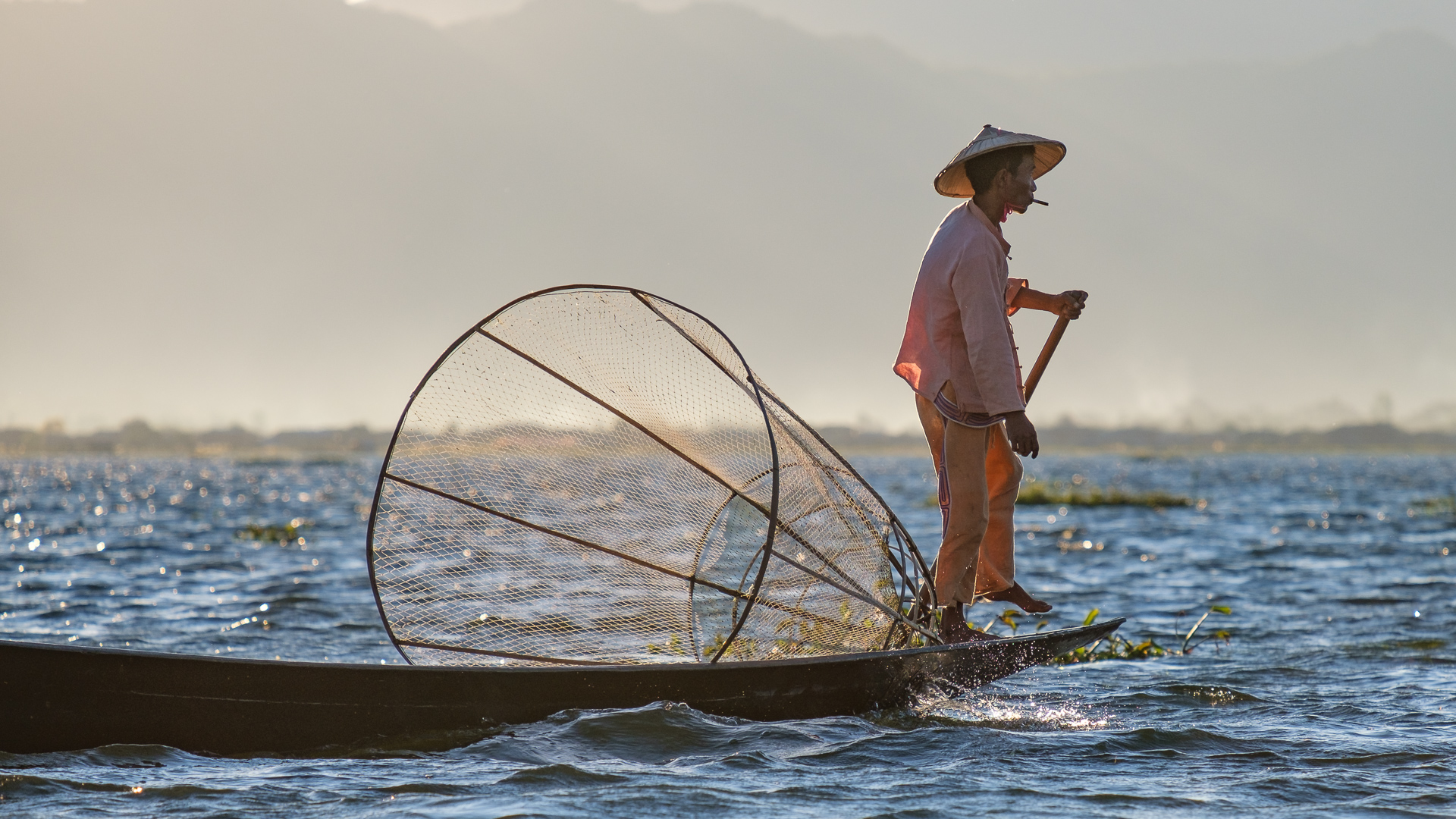Die Einbeinruderer fischen übrigens ganz normal mit T-shirt/Hose oder Longyi. Die weiter unten gezeigten sind in traditionellerer Kleidung – sieht auf dem Foto schöner aus und kostet dann halt ein paar Kyat… (spricht sich tschat)