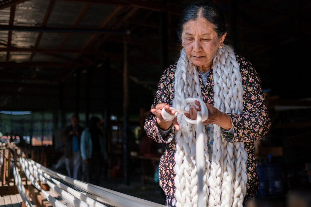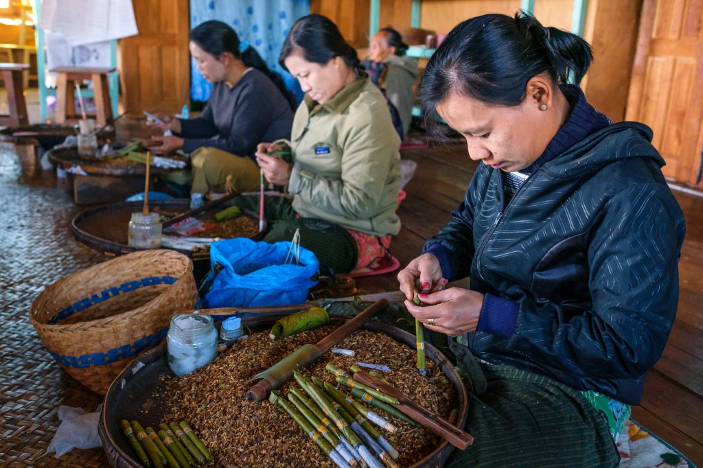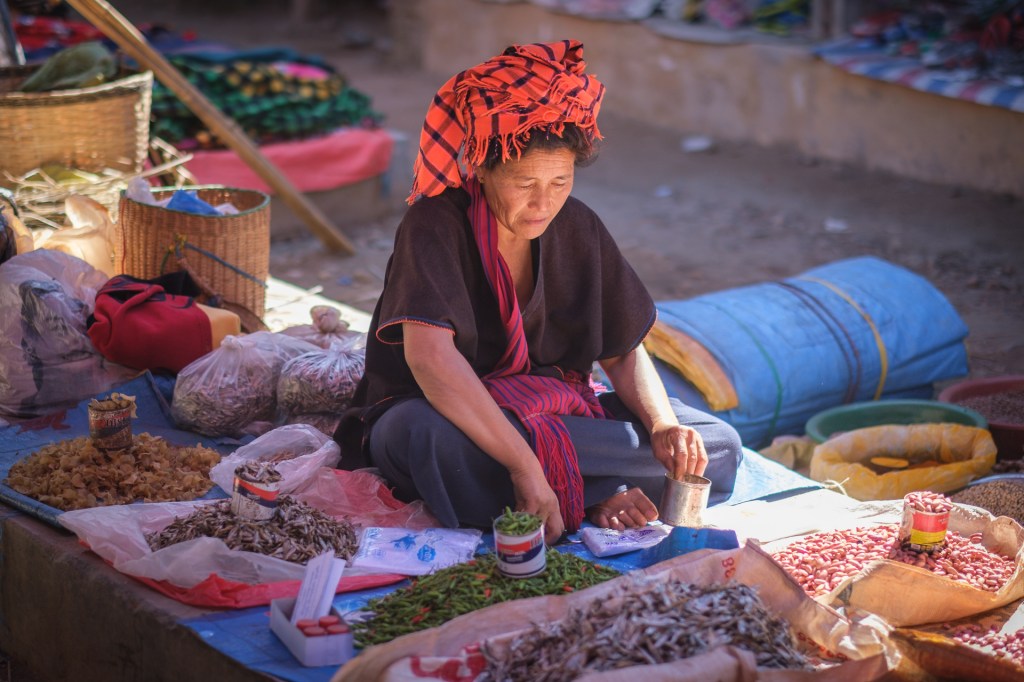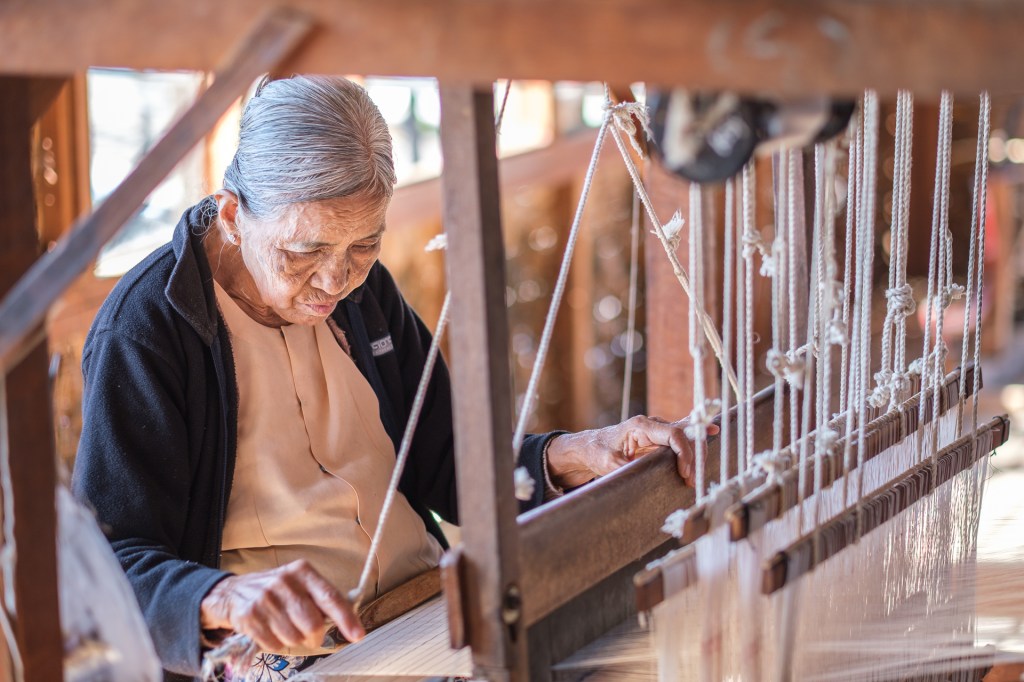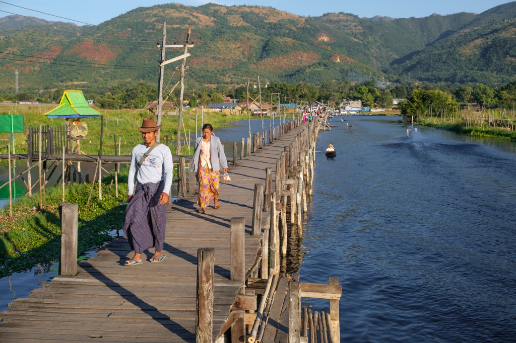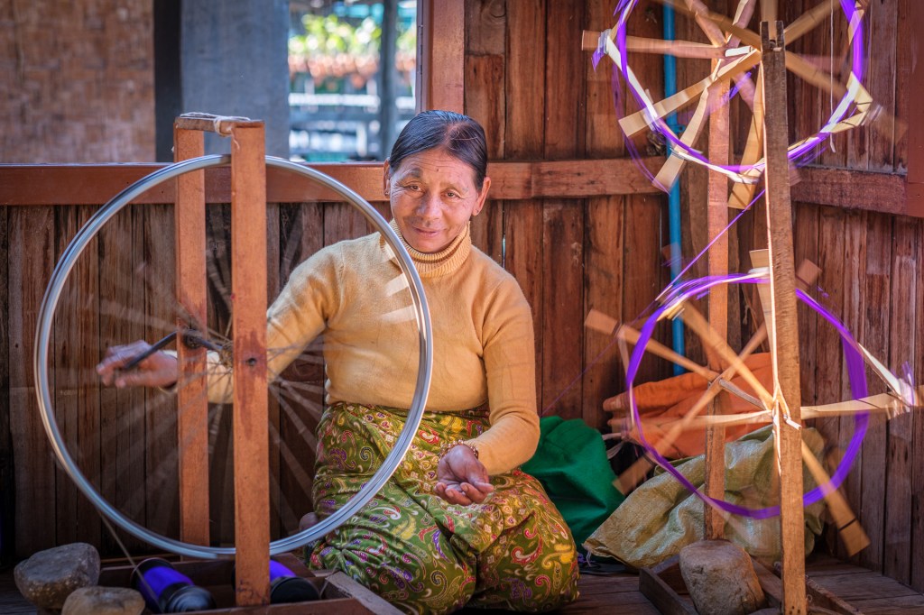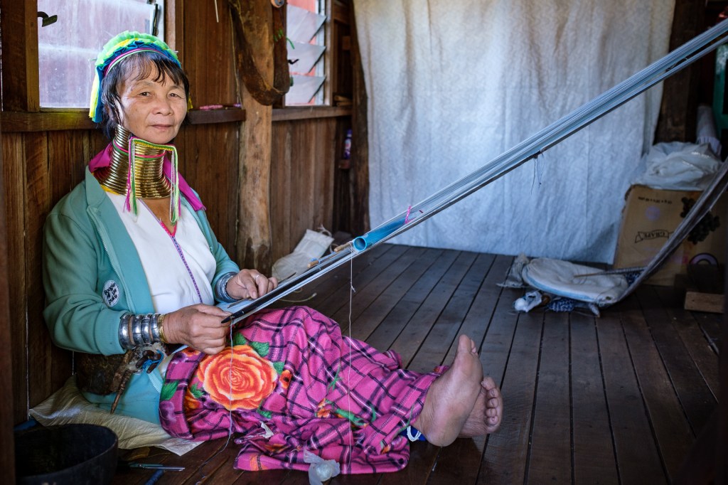 Das war schon etwas seltsam – wir fanden es bisschen wie ein menschlicher Zoo. Die Frauen weben und zeigen die Karen-Webtechnik, sind aber in erster Linie hier als Fotomodells. Die Großmutter trägt übrigens das Maximum von 23 Ringen um den Hals, das sind 6kg! Und am Rest vom Körper noch mal 2 kg! Unglaublich! Viele Karen leben im Kahin State, nur ein Teil der Karen, die Padaung Frauen, tragen diese Ringe. Es beginnt im Alter von 9 Jahren und dann alle 5 Jahre ein neuer Ring. Bei der Großmutter des Mädchens waren da keine 5 Jahre dazwischen…Arbeiten auf dem Feld kann man so definitiv nicht richtig – diese Ethnie liegt auch mit der Zentralregierung immer wieder im Clinch, viele sind auch als Flüchtlinge im angrenzenden Thailand. Aber auch dort werden diese Frauen quasi ausgestellt.