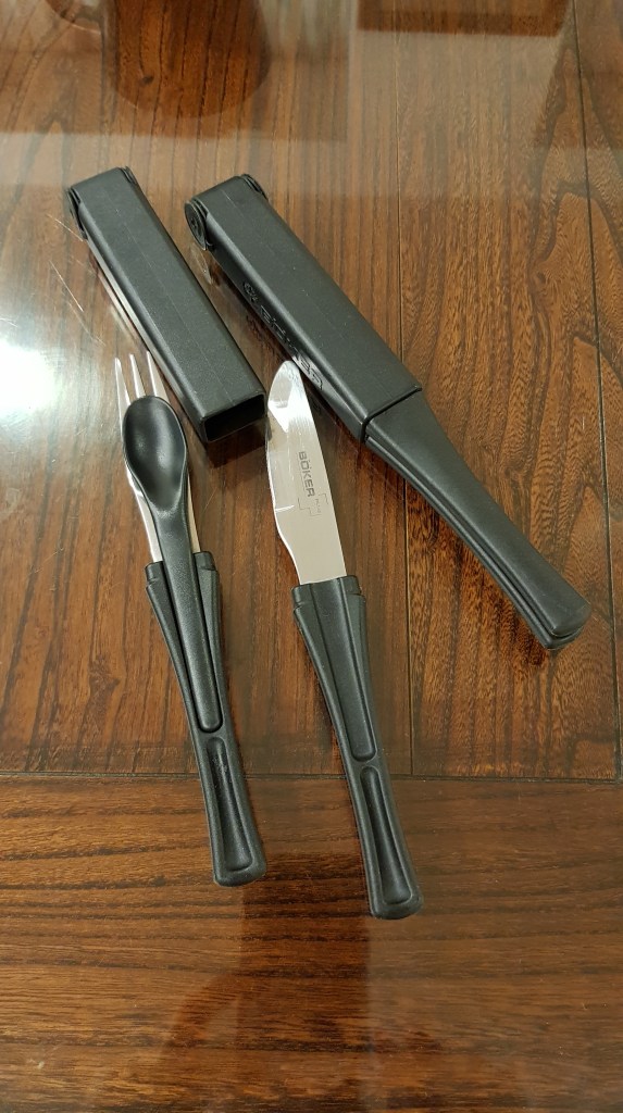Die Böker Messer begleiten uns auf jeder Reise – seit 1988, als ich sie von Judith geschenkt bekam, habe ich sie immer dabei. Für diese Reise habe ich 2 neue angeschafft, die besser in der Hülle bleiben, aber leider nicht mehr so gute Messer haben wie die alten. Aber ohne Böker … geht nicht.