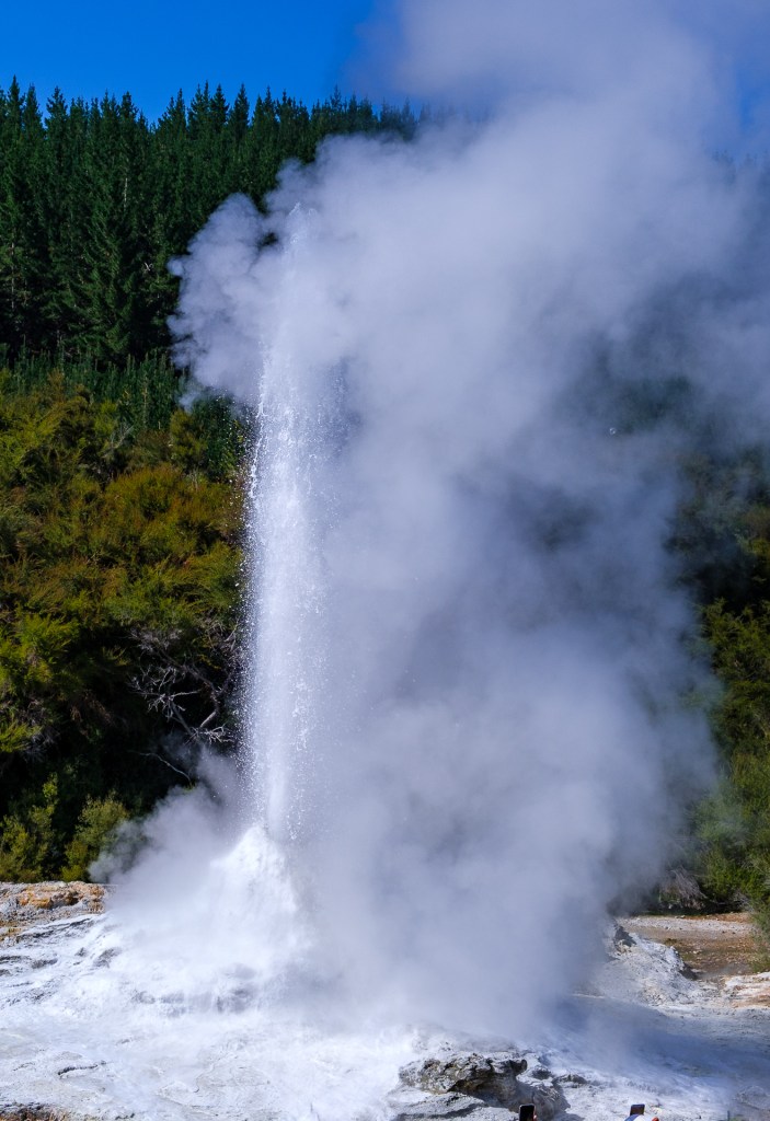 Weiter geht’s Richtung Rotorua. Schon auf dem Weg dampft es aus den Wiesen, es ist Vulkangebiet bzw. Gebiet mit geothermischer Aktivität. Und es fängt an, schwefelig zu riechen… wie nach faulen Eiern.