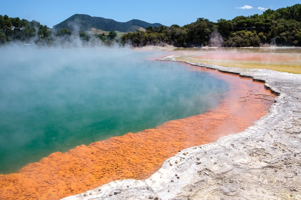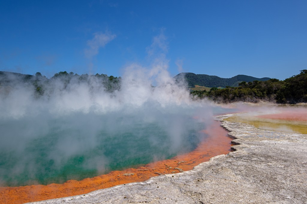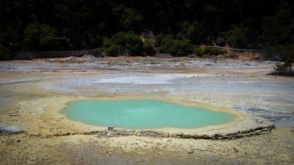 In Wai-o-Tapu, 23km vor Rotorua, gibt es einen Rundweg, an dem man praktisch direkt in die Erde sehen kann. Es blubbert, dampft und stinkt…