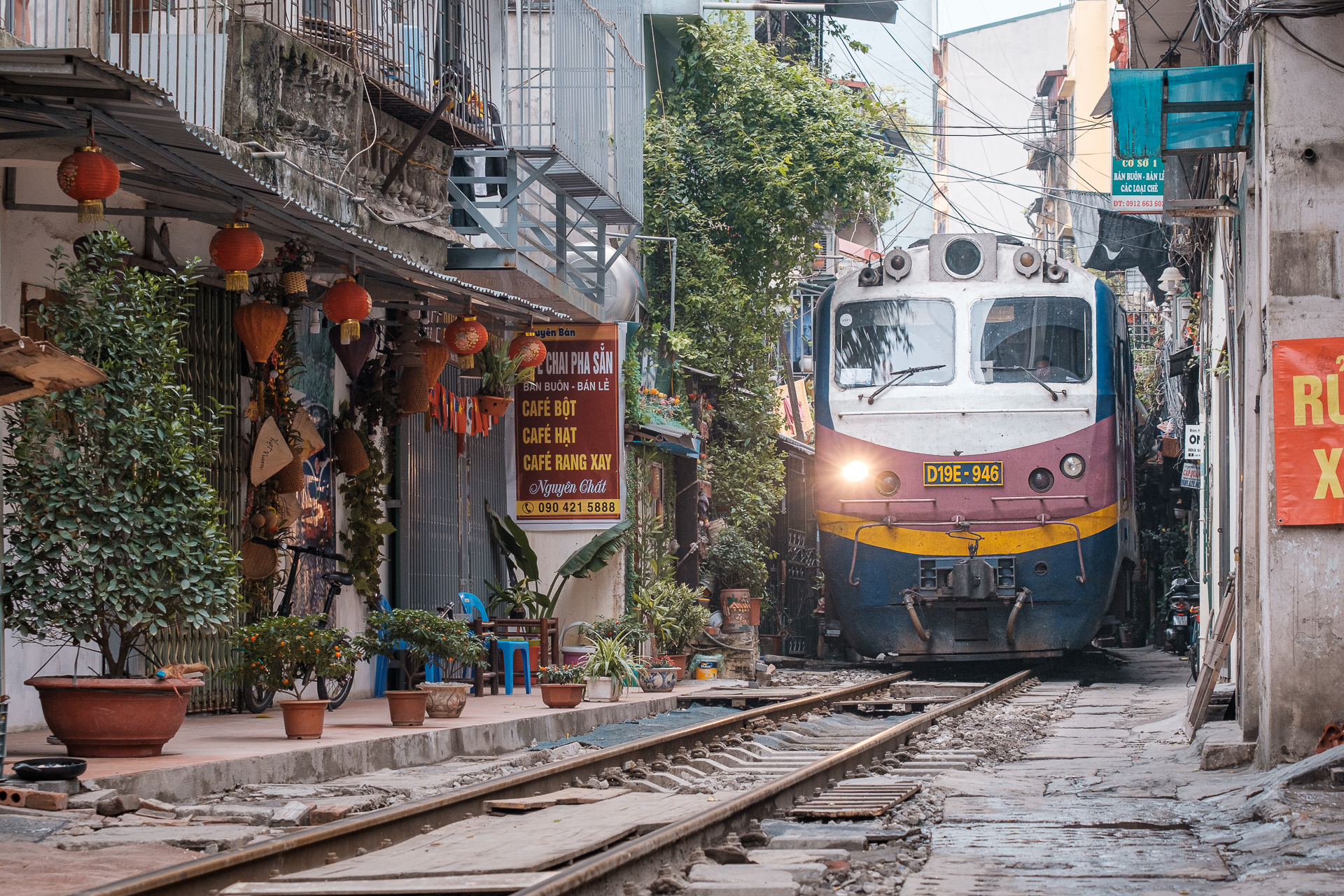 Aber – es gibt noch was anzusehen in Hanoi. Die Train Street bei uns ums Eck! Das ist so kurios! Die Häuser wurden immer näher an die Bahnstrecke gebaut… und wenn der Zug kommt, wird kurz alles weggeräumt. Der fährt wirklich total nah an einem vorbei, unglaublich.